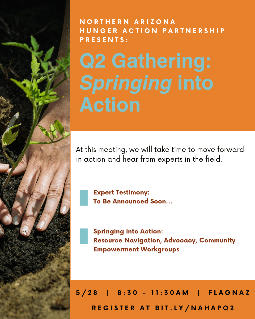 The Northern Arizona Hunger Action Partnership Quarter 2 Gathering brings together regional partners working to address food insecurity across Northern Arizona. This convening provides an opportunity to share updates, strengthen collaboration, and coordinate strategies that support more effective and equitable hunger relief efforts. Participants will engage in discussion, resource sharing, and collective planning to advance ongoing work across the region.